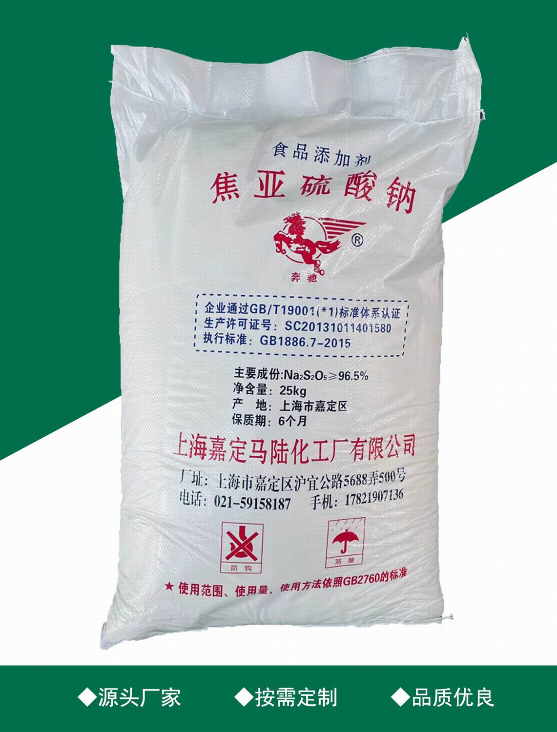 上海嘉定馬陸化工廠有限公司主營生產(chǎn),焦亞硫酸鈉、亞硫酸氫鈉等產(chǎn)品生產(chǎn),幾十年的專注焦亞硫酸鈉研發(fā)生產(chǎn),公司擁有完整、科學(xué)的質(zhì)量管理體系,為確保公司產(chǎn)品能夠長期立足于市場,增強客戶的粘性,可滿足客戶的非標(biāo)定制需求,可提供產(chǎn)品各個用途的解決方案,公司重信譽、守合同、保質(zhì)量、快速發(fā)貨以,我們擁有專業(yè)的售前售中、售后團(tuán)隊共同協(xié)作,確保用戶采購中的每個環(huán)節(jié)都能有滿意的體驗度。